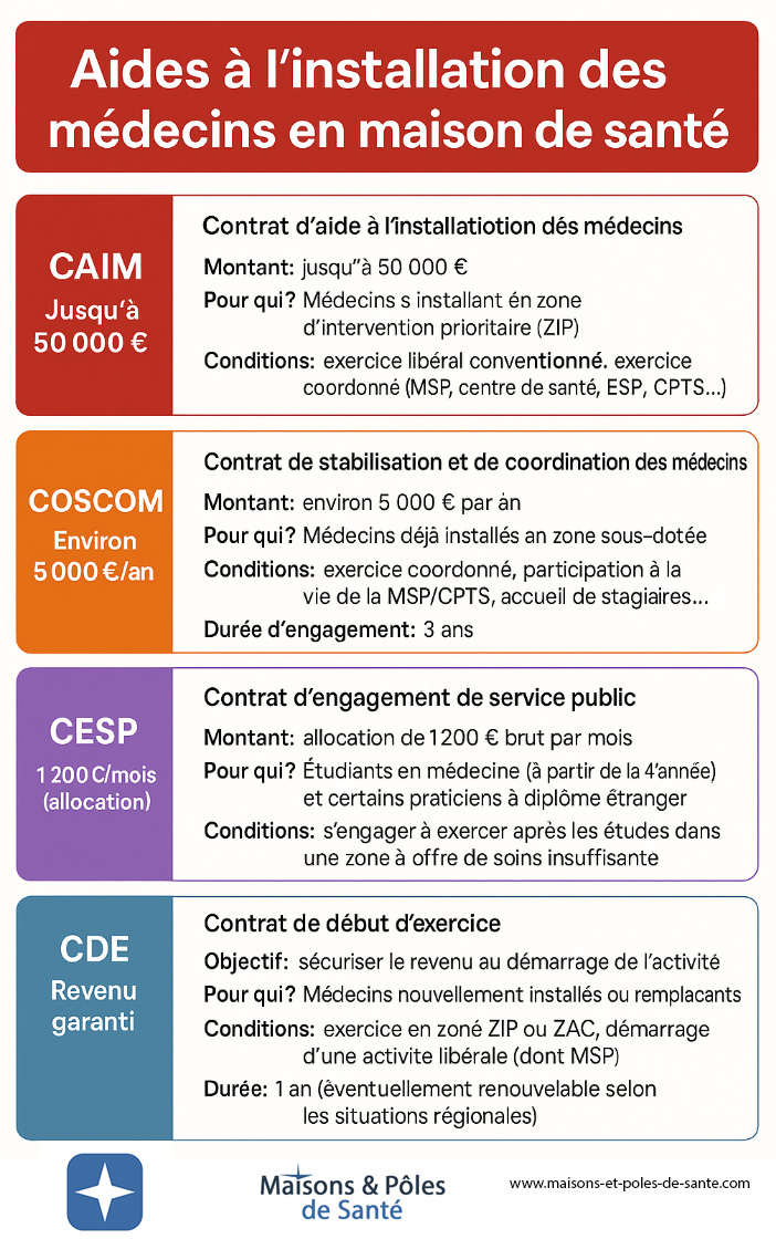 L’installation en maison de santé offre un cadre structuré, attractif et durable pour les médecins de premier recours. Les dispositifs CAIM, COSCOM, CDE ou encore CESP soutiennent financièrement ces choix et répondent à un objectif national : renforcer l’accès aux soins dans les territoires.